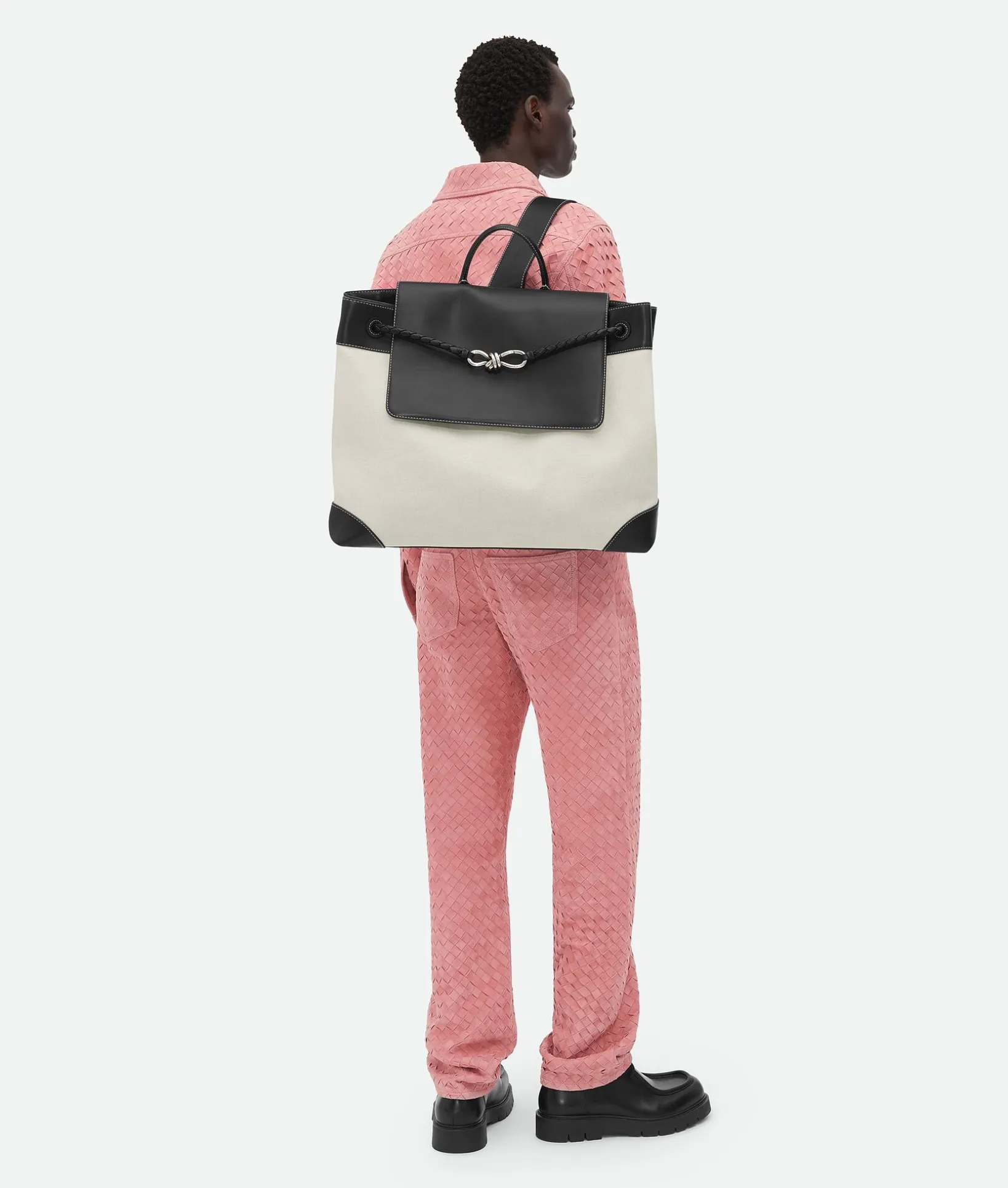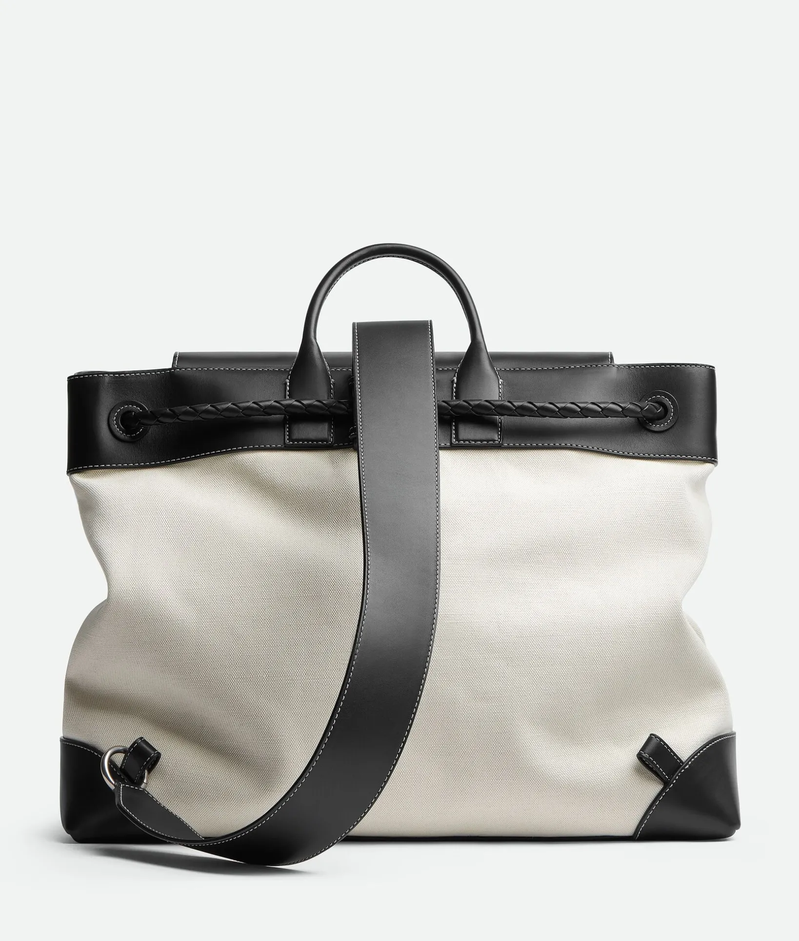 • Large backpack in weathered leather and canvas with single back strap and top handle