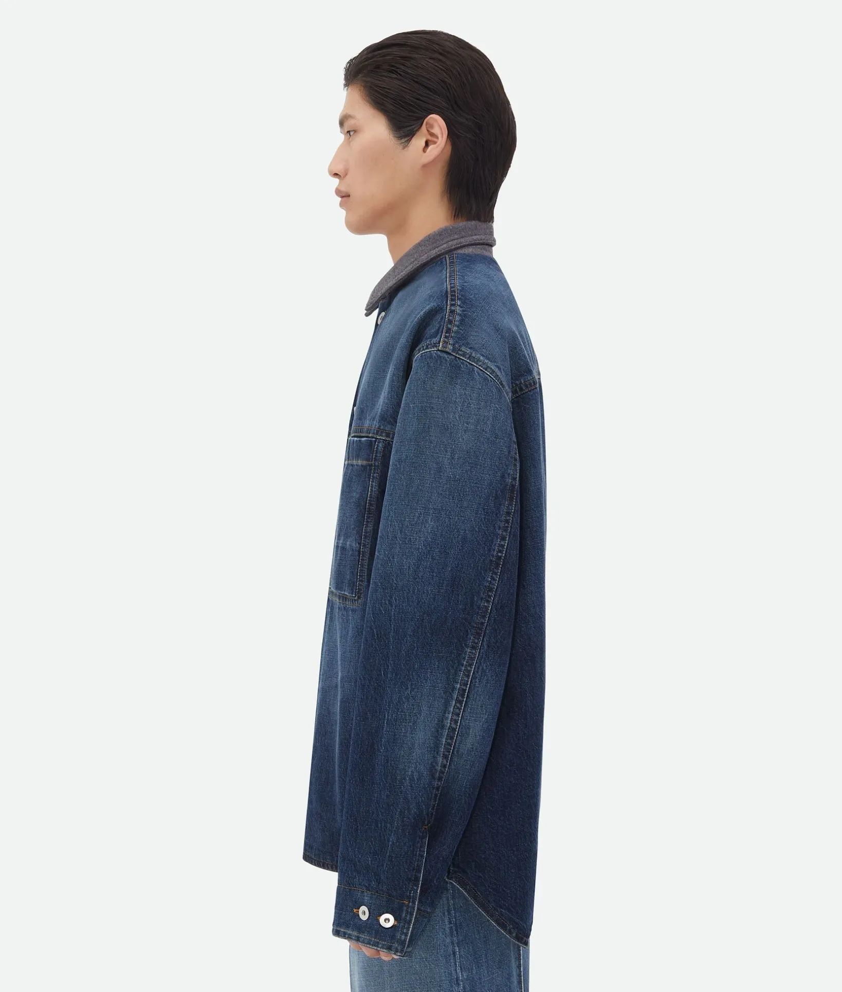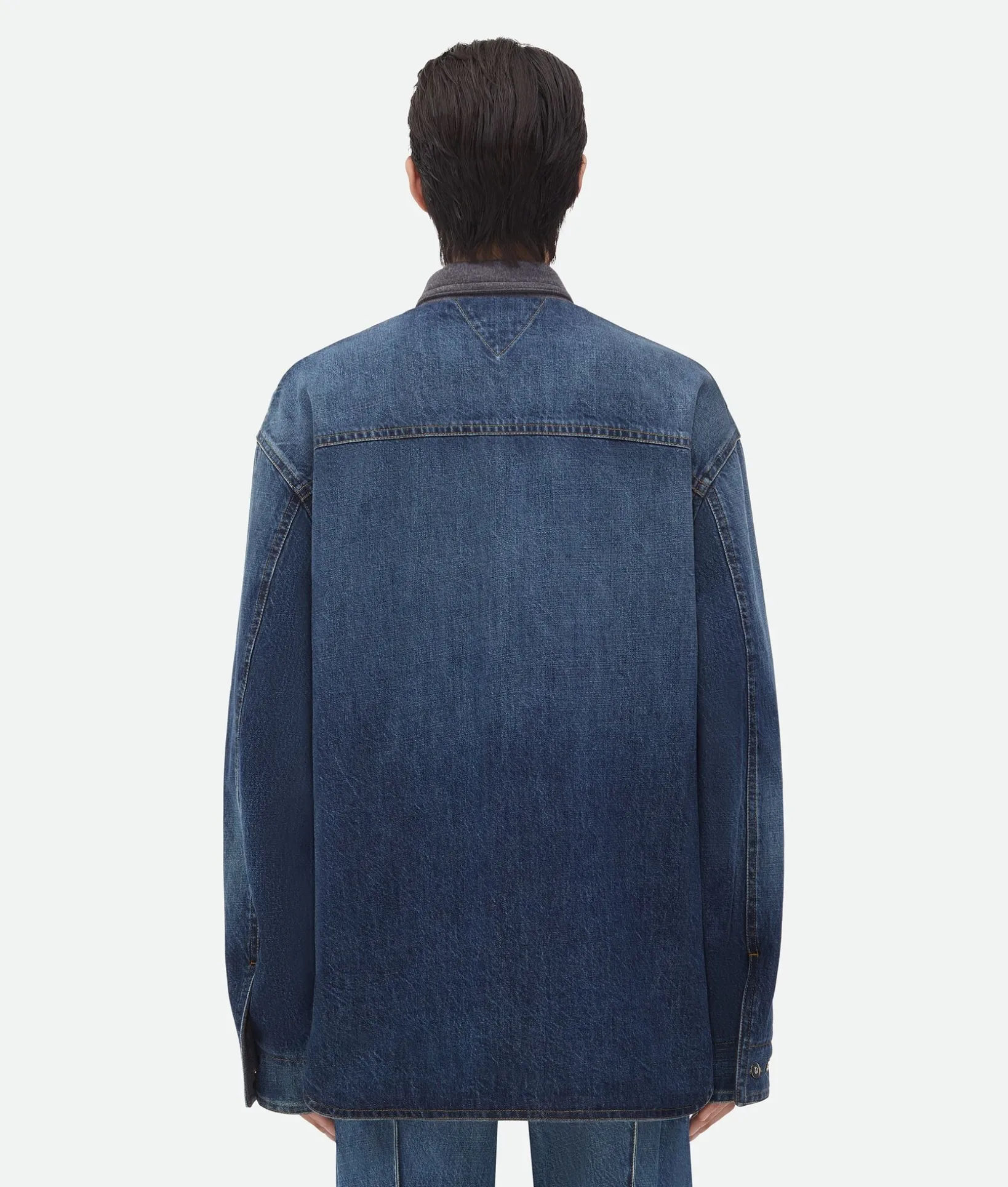 • Reversible medium wash indigo wool denim jacket