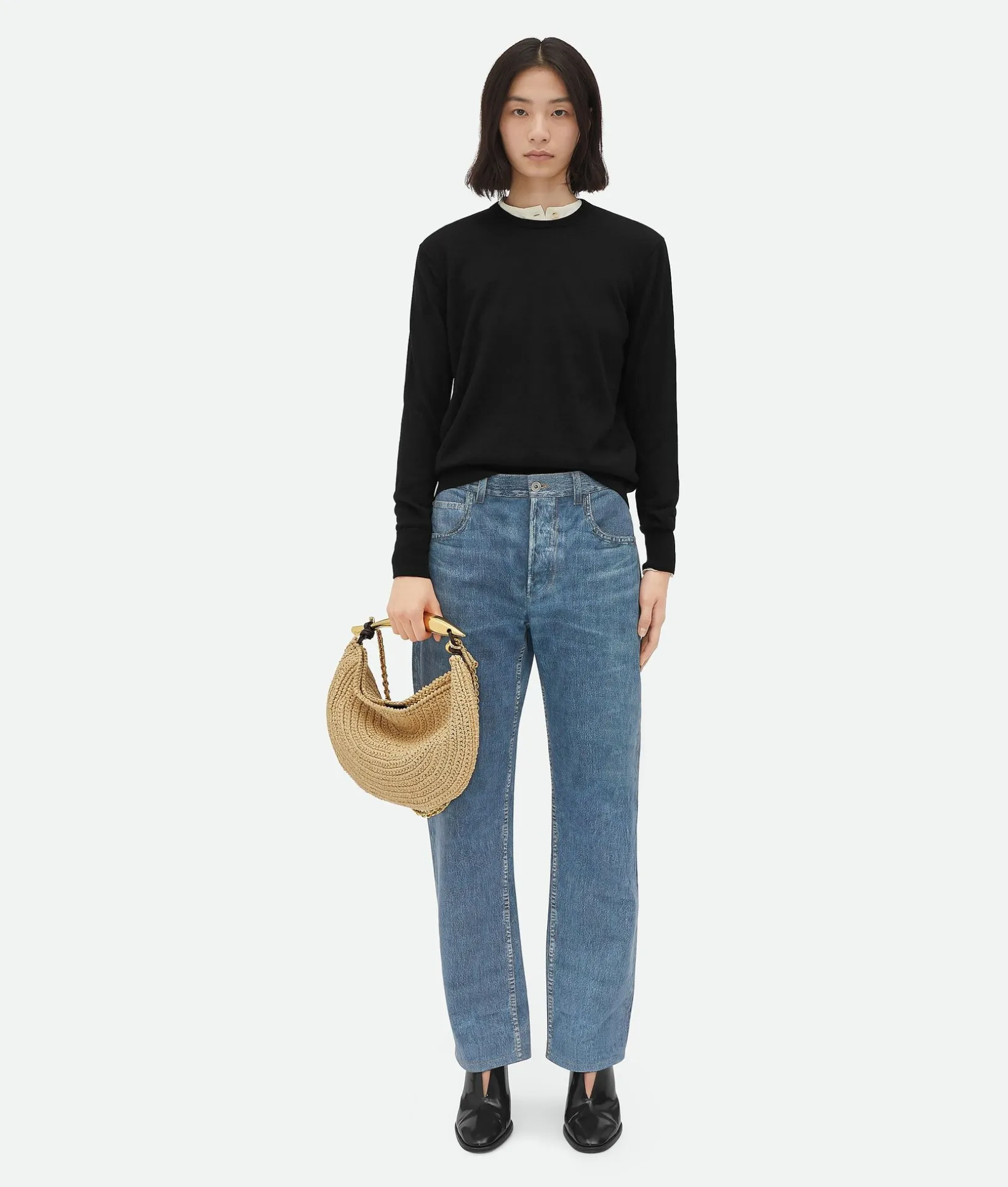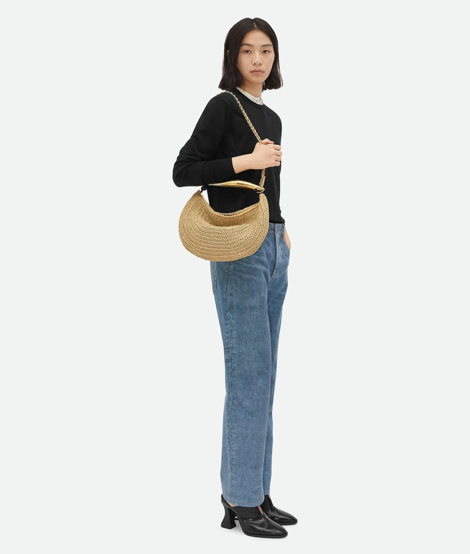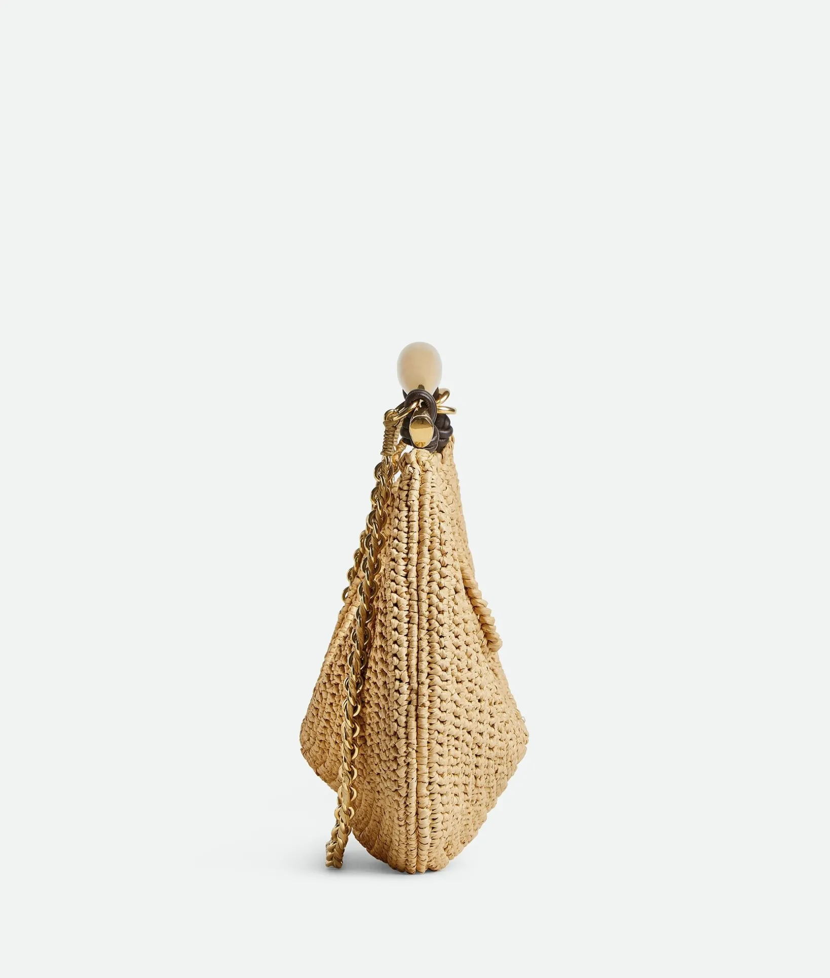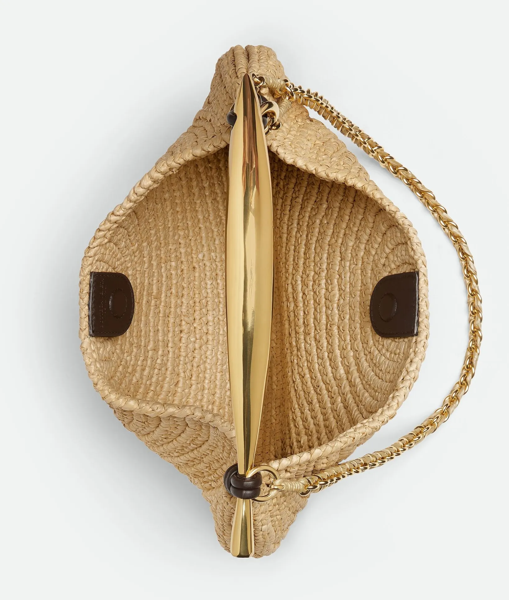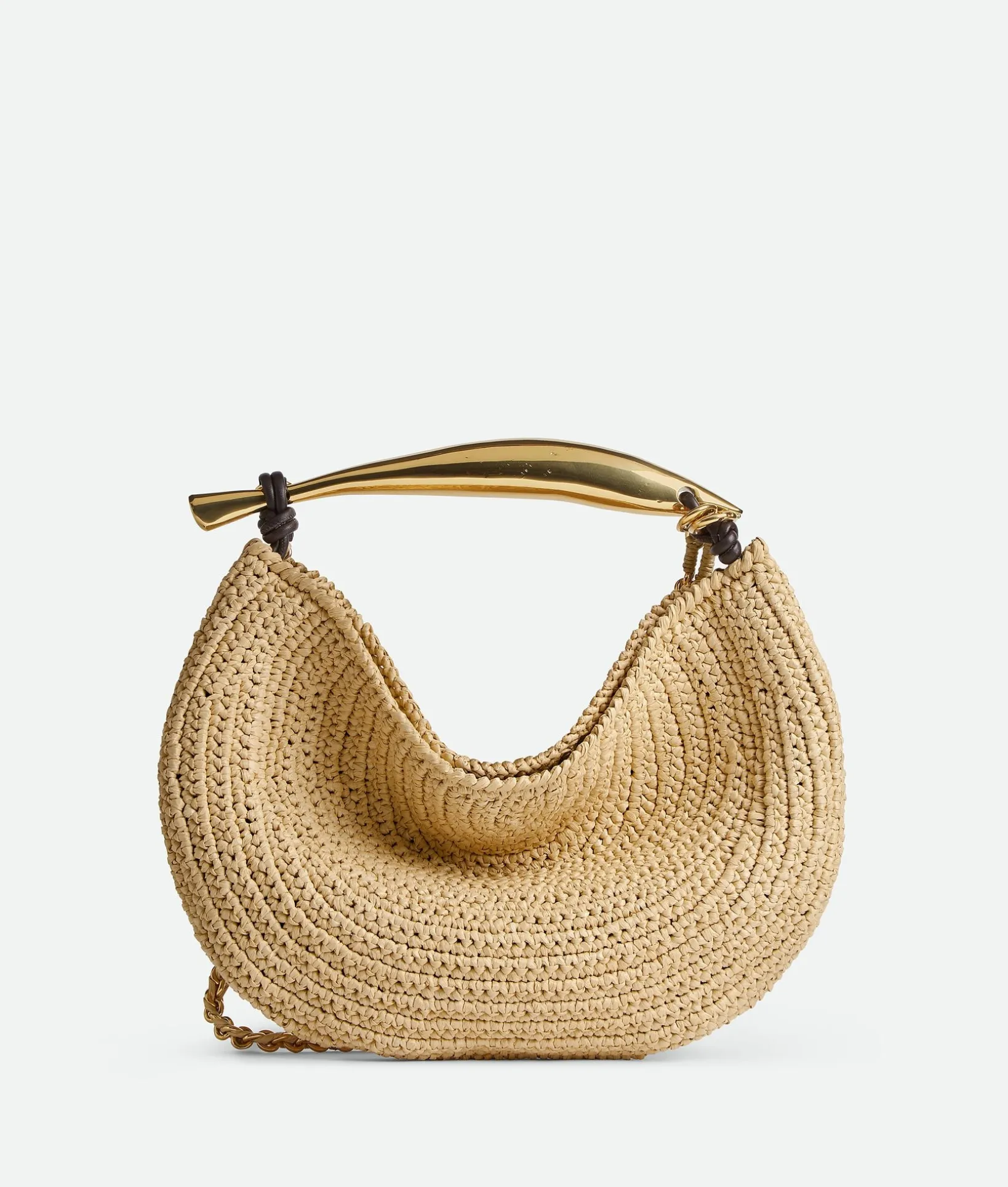 • Small raffia crochet bag with metallic top handle enriched by a leather braided shoulder chain