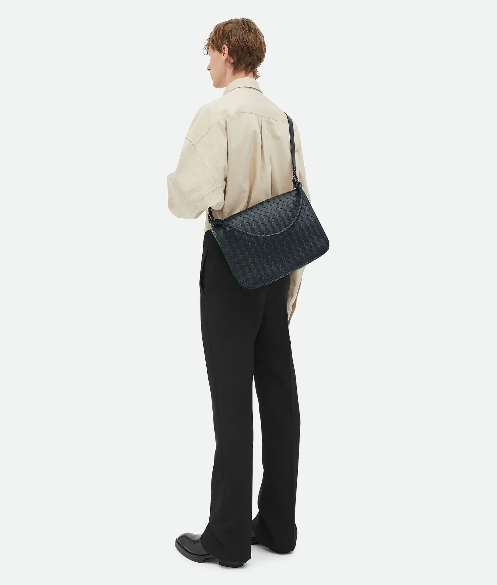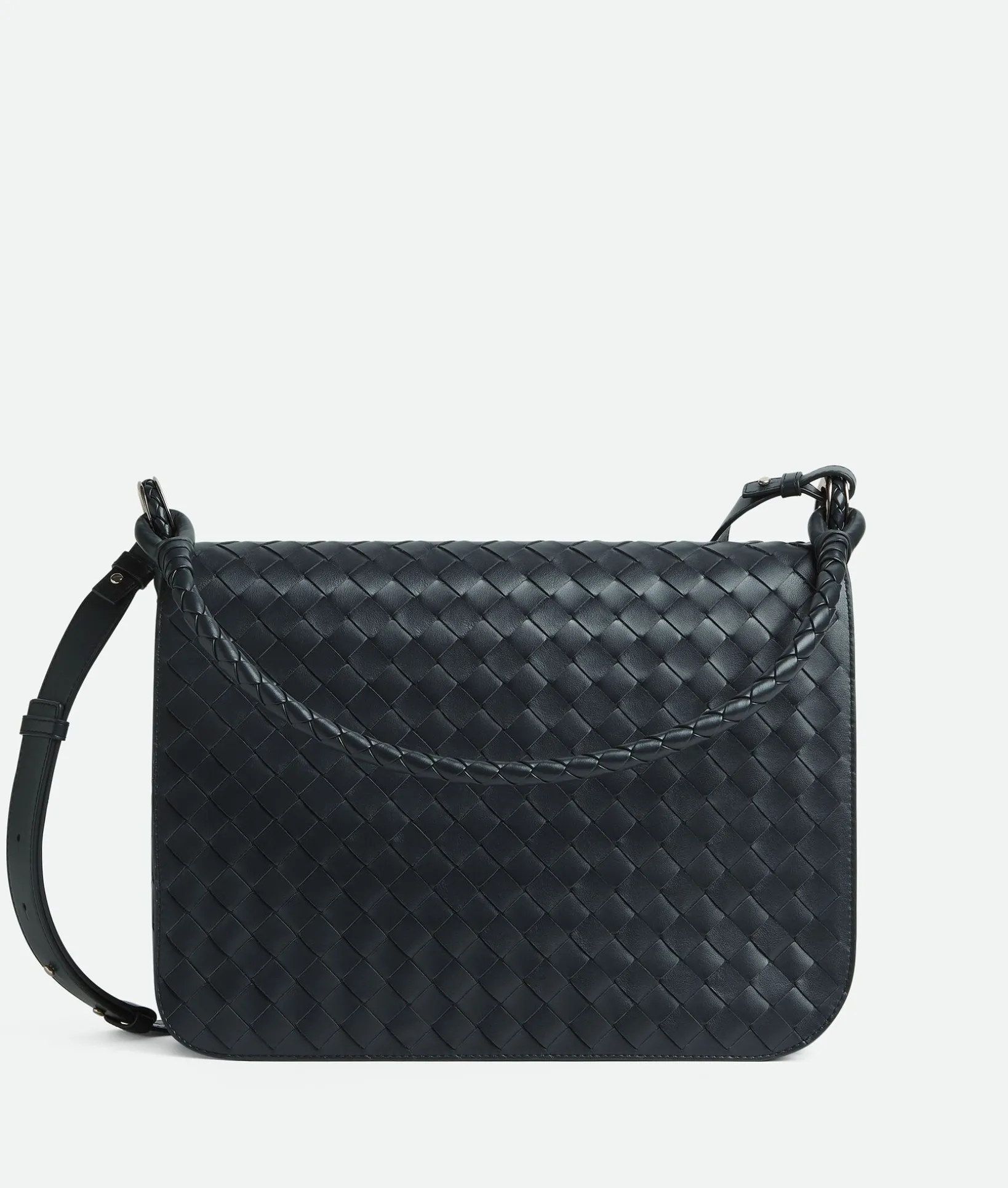 • Intrecciato leather messenger with one adjustable and detachable cross-body strap and one coaxial shoulder strap