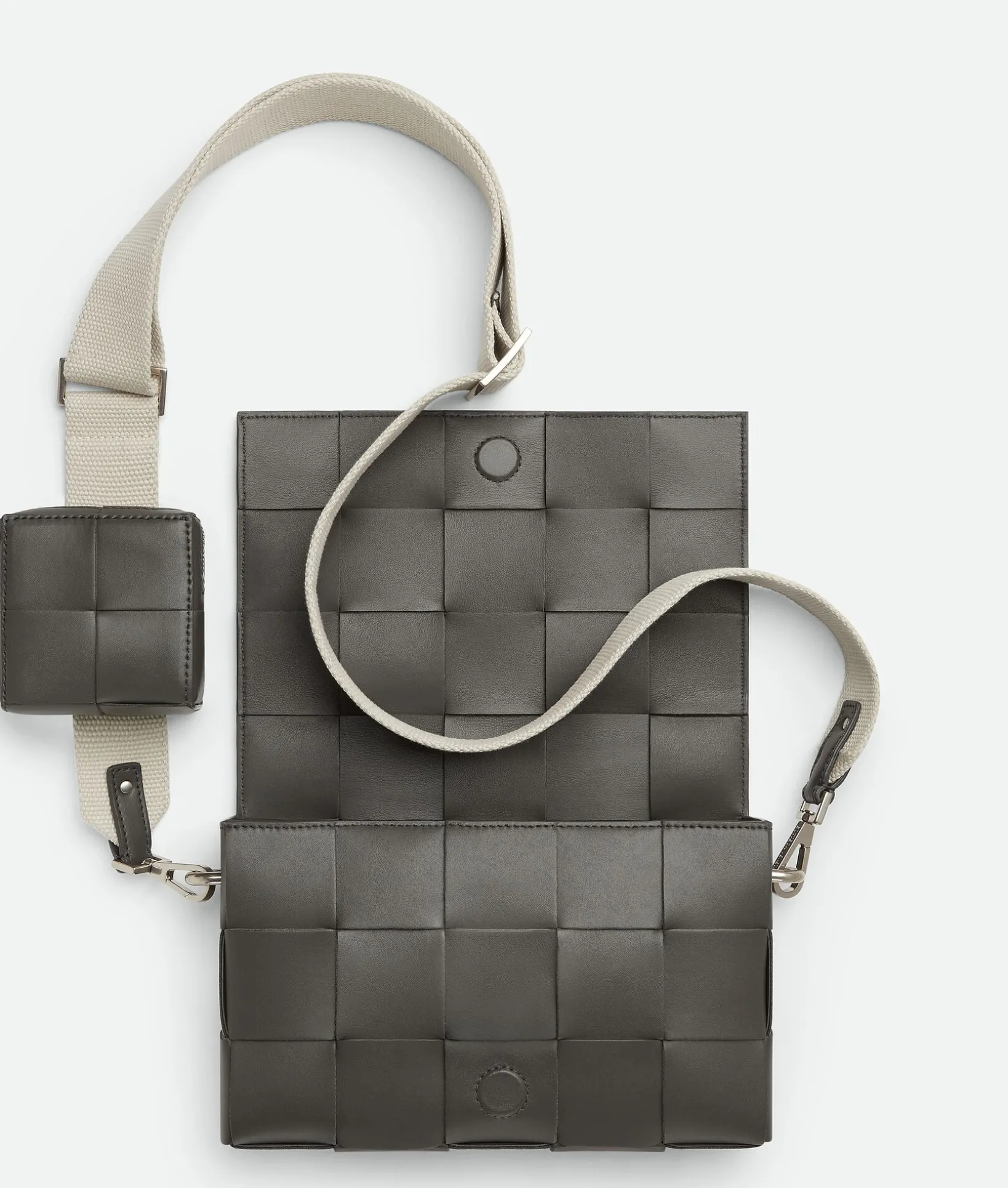 • Detachable and adjustable strap in contrasted canvas with one Intreccio leather slide-on zippered pouch for AirPods