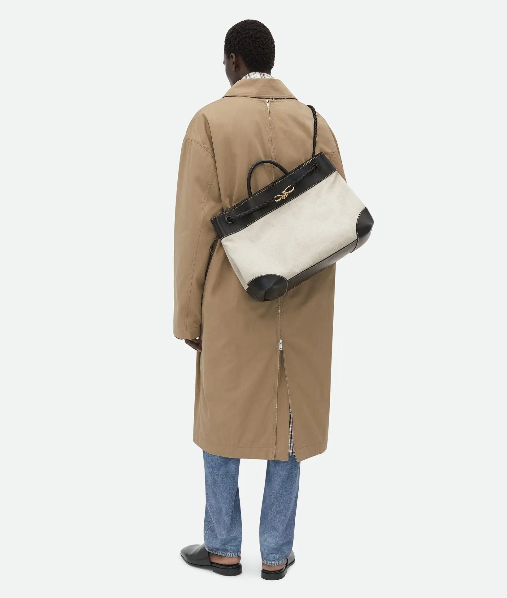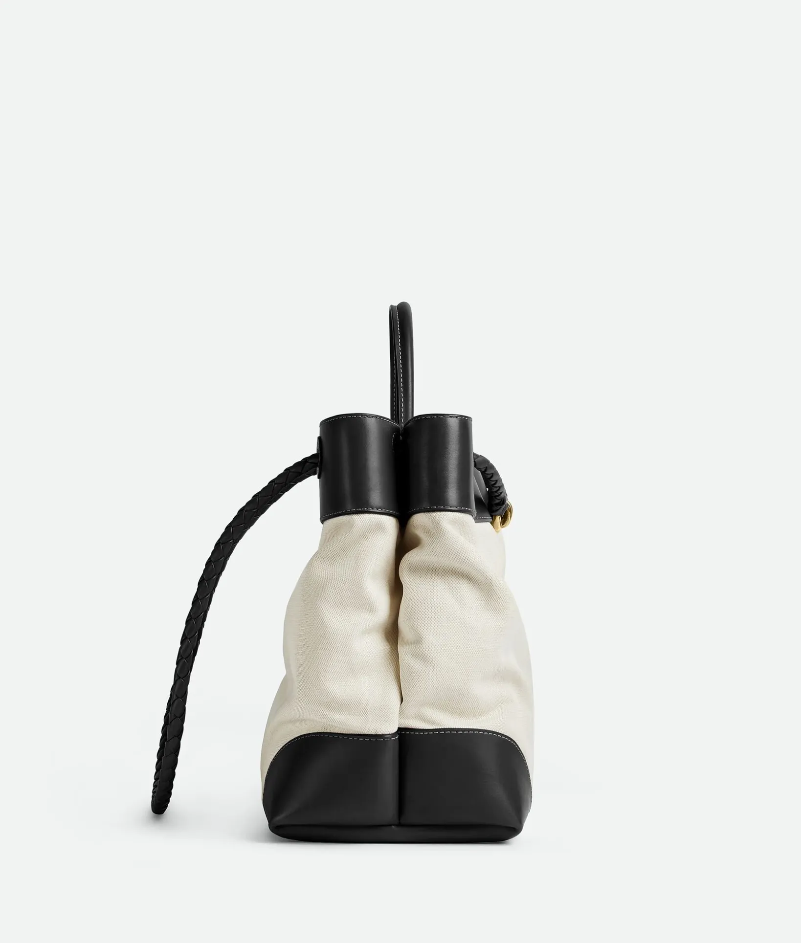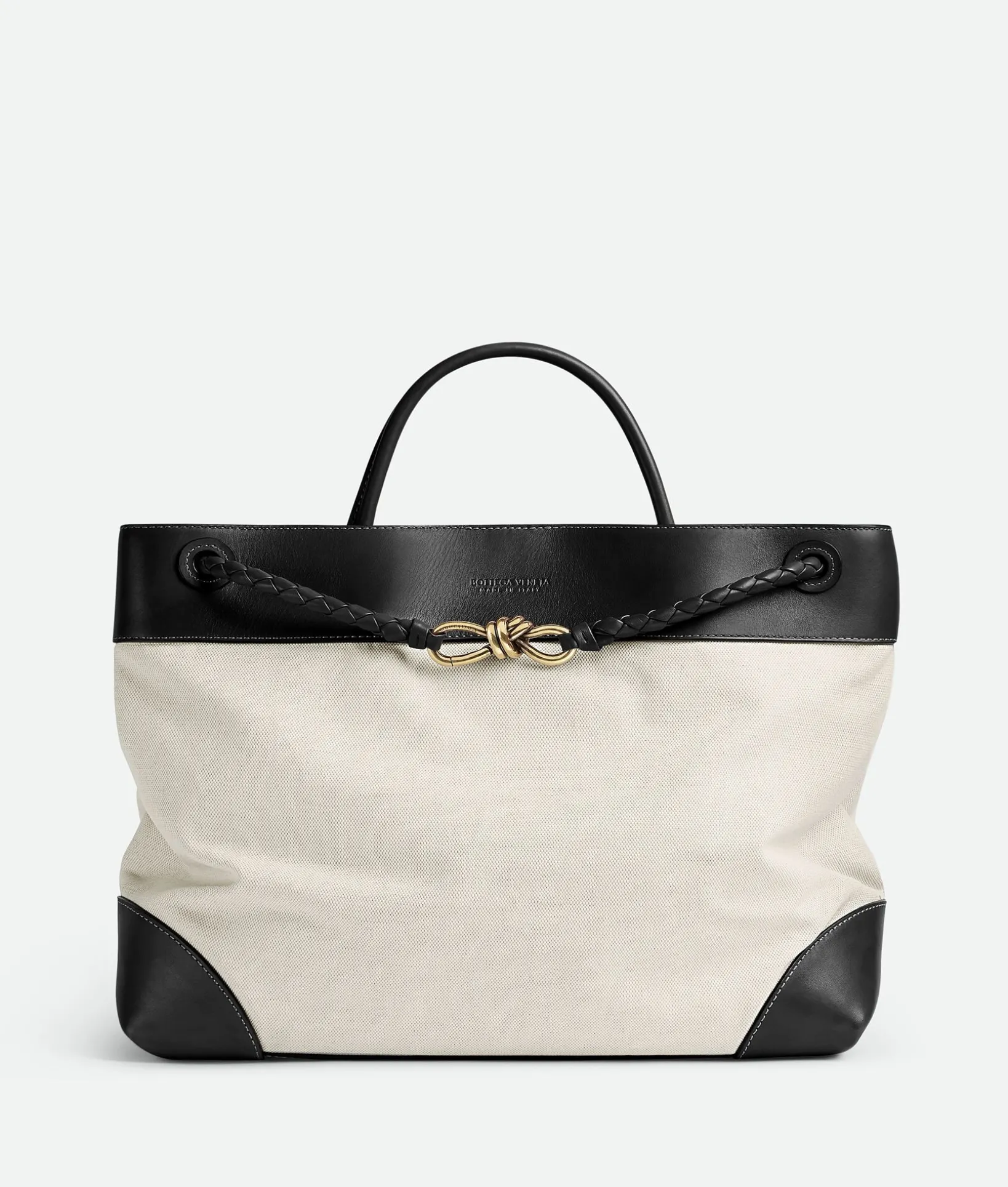 • Large top handle bag in calf leather and canvas with sliding cross-body strap