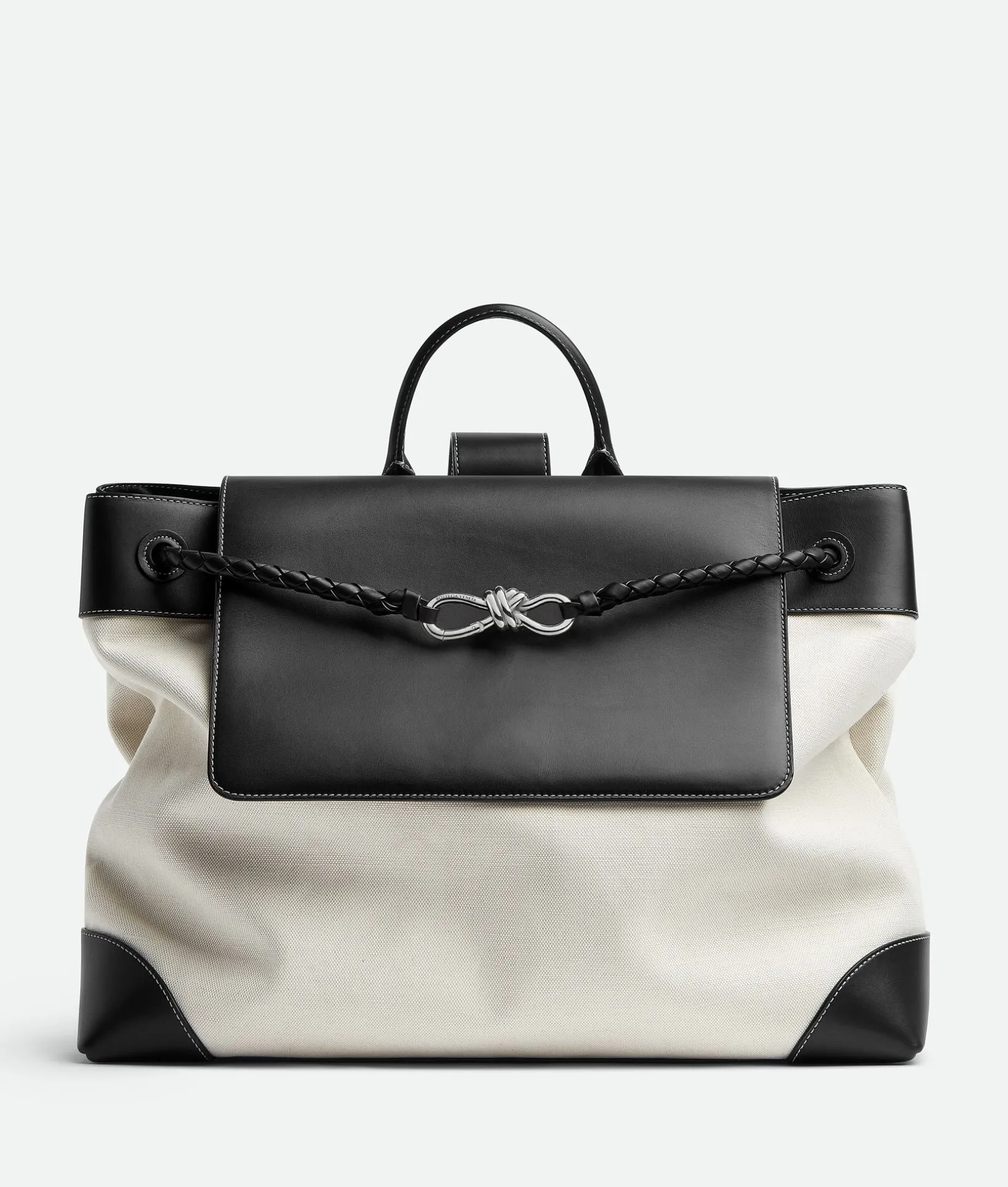 • Large backpack in weathered leather and canvas with single back strap and top handle